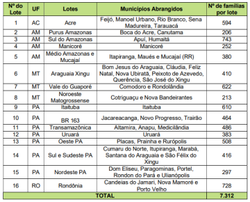 Os municípios a serem atendidos foram organizados em lotes, definidos a partir de critérios de distribuição geográfica agrupados em núcleos operacionais e de dinâmicas territoriais, considerando o planejamento logístico e as especificidades regionais. A área de abrangência do projeto contempla 48 municípios, distribuídos em seis estados, localizados no Acre, Amazonas, Mato Grosso, Pará, Rondônia e Roraima, com atendimento estimado de 7.312 unidades familiares, veja abaixo: