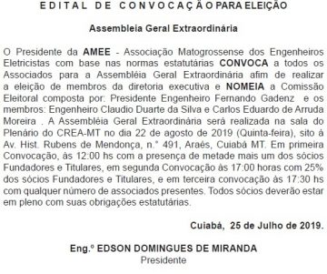 Com base nas normas estatutárias, a Associação Mato-Grossense dos Engenheiros Eletricistas (AMEE), convoca todos os associados para Assembleia Geral Extraordinária no dia 22 de agosto no Plenário do Conselho Regional de Engenharia e Agronomia de Mato Grosso (Crea-MT), as 17h, afim de realizar a eleição de membros da diretoria executiva da AMEE. A inscrição para se candidatar deve ser enviada pelo e-mail: amee.mt@gmail.com , até o dia 22 de agosto às 16h.