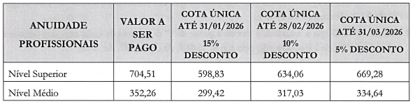 Já o desconto de 90% e incidirá sobre o valor da anuidade estabelecida para o exercício, não havendo acumulação de benefício ou parcelamento devendo o pagamento ser efetuado em cota única para os seguintes casos: