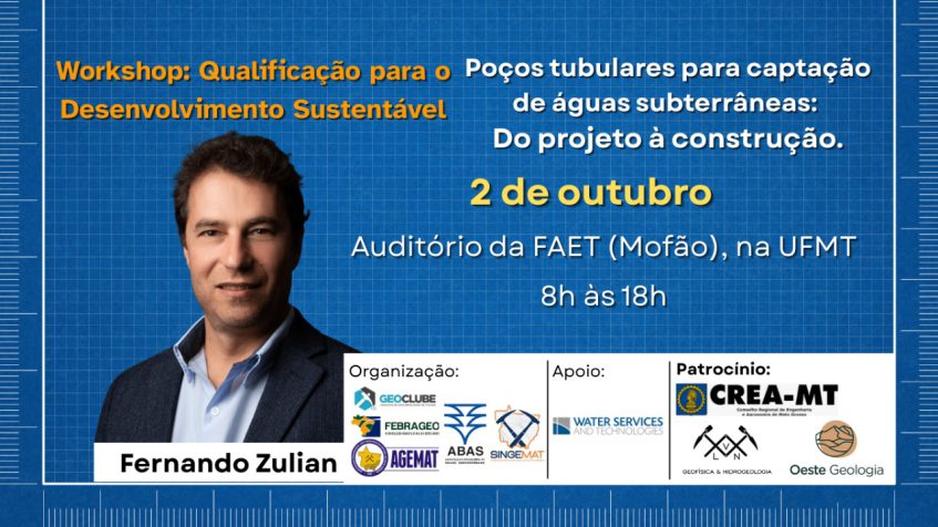 Cuiabá se prepara para receber, no próximo dia 2 de outubro, o renomado geólogo Fernando Zulian para o workshop “Poços tubulares para captação de águas subterrâneas – do projeto à construção”. O evento, que será realizado no Auditório João Barbuino (Mofão), na Universidade Federal de Mato Grosso (UFMT), tem como objetivo capacitar os participantes sobre as melhores práticas para projetar e construir poços, em conformidade com as normas técnicas.