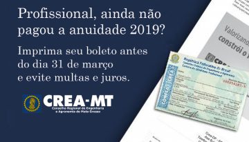 Os profissionais registrados no Conselho Regional de Engenharia e Agronomia de Mato Grosso (Crea-MT), têm até o dia 31 de março para pagar a Anuidade 2019 sem juros e multas. Os boletos à vista ou parcelados podem ser emitidos pelo site do Conselho www.crea-mt.org.br, acessando o link “Anuidade 2019” na guia de serviços.