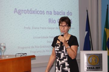 A engenheira química, Eliana Dores falou sobre a contaminação do ambiente por pesticida. Bem como carreamento das moléculas pelo escoamento superficial, tanto adsorvidos aos sedimentos quanto solubilizados na água que podem atingir as águas superficiais. Falou também da possibilidade de ocorrer lixiviação das moléculas ao longo do perfil do solo, até atingir as águas subterrâneas.